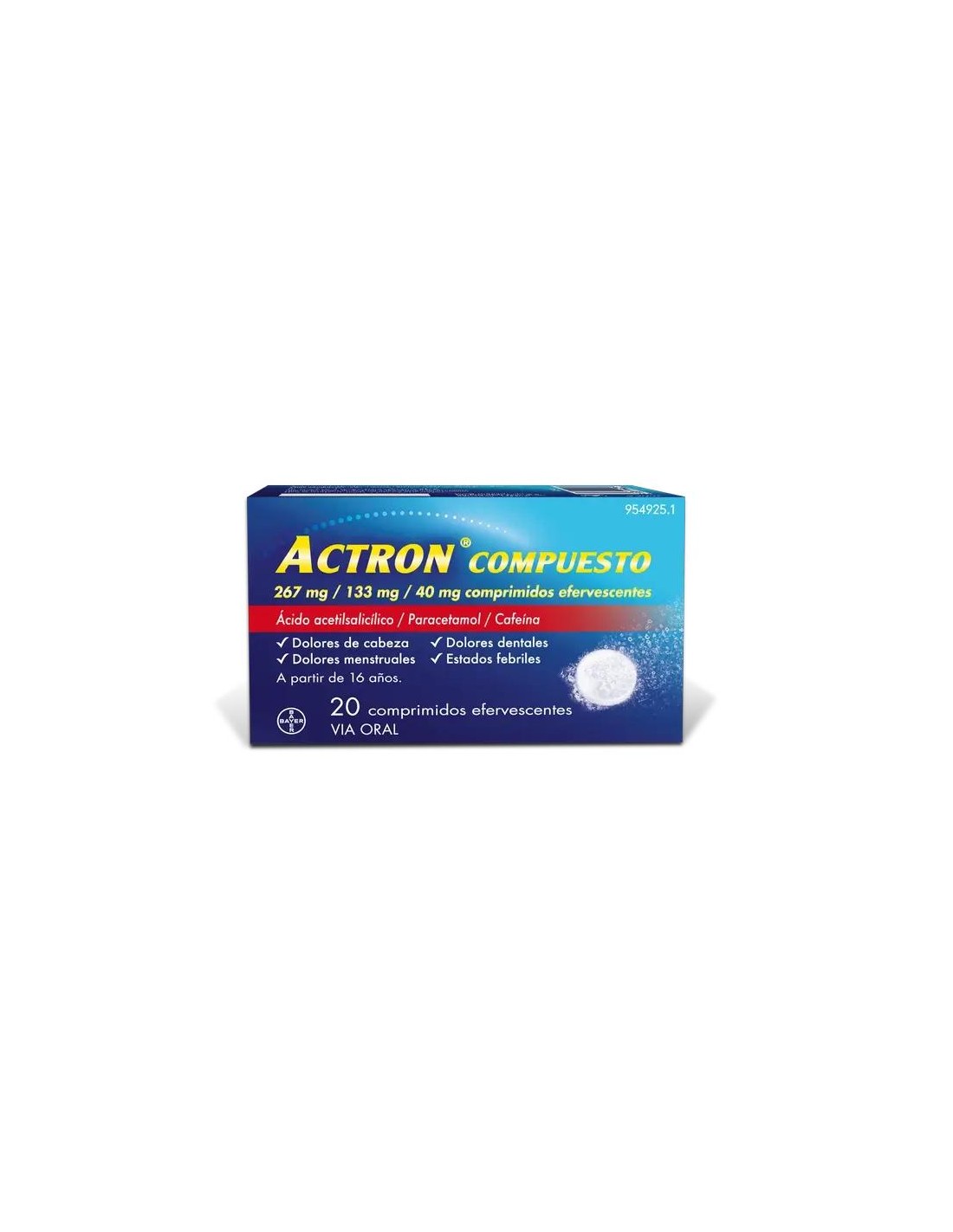 Los principios activos de Actron Compuesto son los siguientes : 267 mg de ácido acetilsalicílico, 133 mg de paracetamol y 40 mg de cafeína . El resto de excipientes son: hidrogenocarbonato de sodio y ácido cítrico.